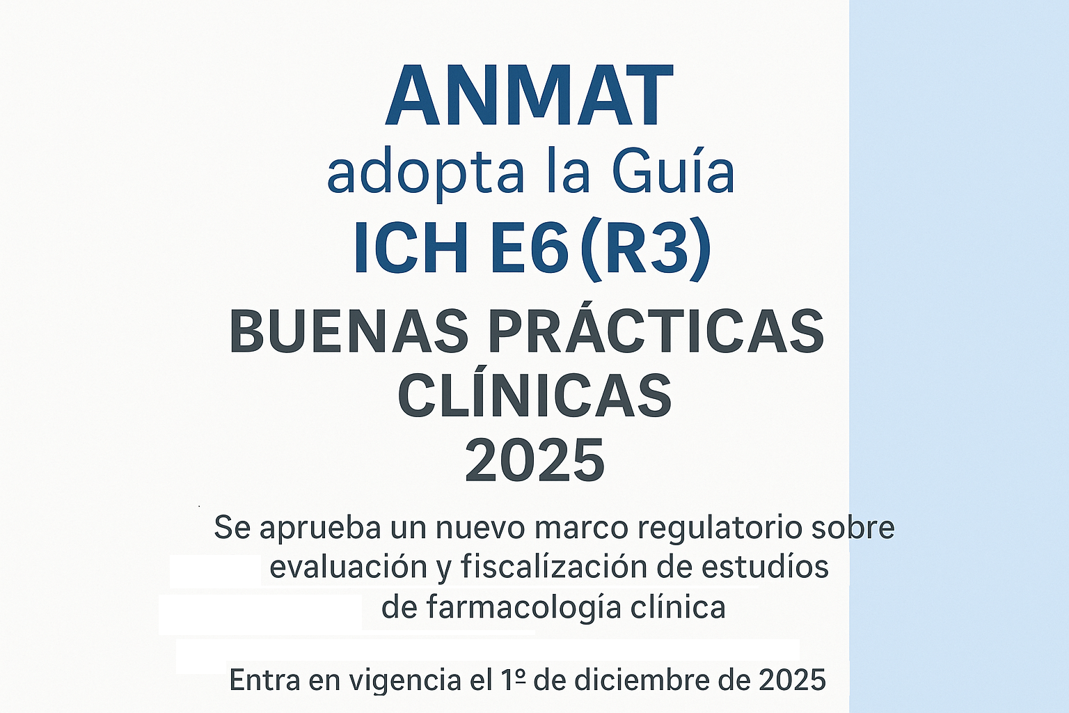 ANMAT actualiza las normas de Buenas Prácticas Clínicas y adopta la guía ICH E6(R3) Con la Disposición N° 7516/2025, la ANMAT aprueba un nuevo marco regulatorio sobre Buenas Prácticas Clínicas (BPC), Evaluación y Fiscalización de Estudios de Farmacología Clínica con fines registrales, reemplazando las disposiciones anteriores (6677/10, 4008/17, 9929/19 y 2172/25). ¿Qué implica esta actualización? • Adopta oficialmente la Guía ICH E6(R3), el estándar internacional más reciente para la conducción de ensayos clínicos. • Refuerza la protección de los sujetos de investigación y la confiabilidad de los datos. • Establece criterios más precisos sobre evaluación, autorización y fiscalización de los estudios de farmacología clínica. • Promueve la armonización regulatoria y el fortalecimiento de los Comités de Ética en Investigación. • Facilita la participación de Argentina en investigaciones internacionales y mejora la trazabilidad y transparencia del proceso. Un paso clave hacia la excelencia regulatoria. Esta actualización coloca a la Argentina en línea con las mejores prácticas globales, consolidando su rol como Autoridad Reguladora Nacional de Referencia Regional (OPS) y Miembro Regulador del ICH. Entra en vigencia el 1° de diciembre de 2025.