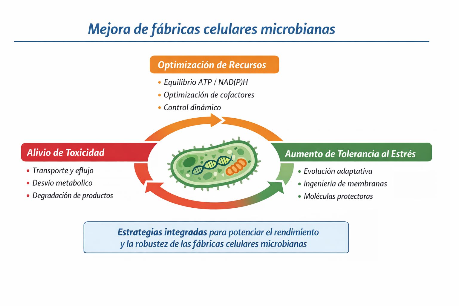 Este artículo revisa estrategias para mejorar la actividad de microbios utilizados en bioproducción industrial. Se enfocan en aliviar toxicidad por sustratos y productos, optimizar la asignación de recursos metabólicos y fortalecer tolerancia al estrés mediante evolución y diseño celular. La síntesis de cofactores y la ingeniería de membranas se destacan como claves para mantener balance entre crecimiento y producción. Se identifican retos y posibles direcciones futuras para desarrollar células microbianas robustas y eficientes.