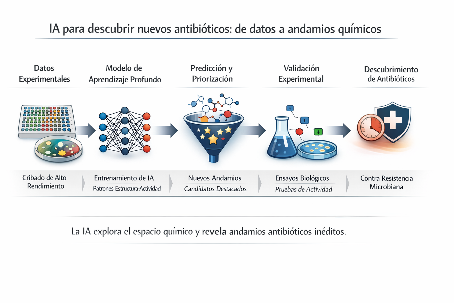 Se describe el uso de modelos de aprendizaje profundo entrenados con datos de cribado de alto rendimiento para identificar estructuras químicas novedosas con potencial actividad antibiótica. Este enfoque IA permite priorizar compuestos candidatos y acelerar el descubrimiento de nuevas moléculas que podrían superar mecanismos de resistencia, ofreciendo una herramienta promissoria frente a la emergencia de bacterias multirresistentes.