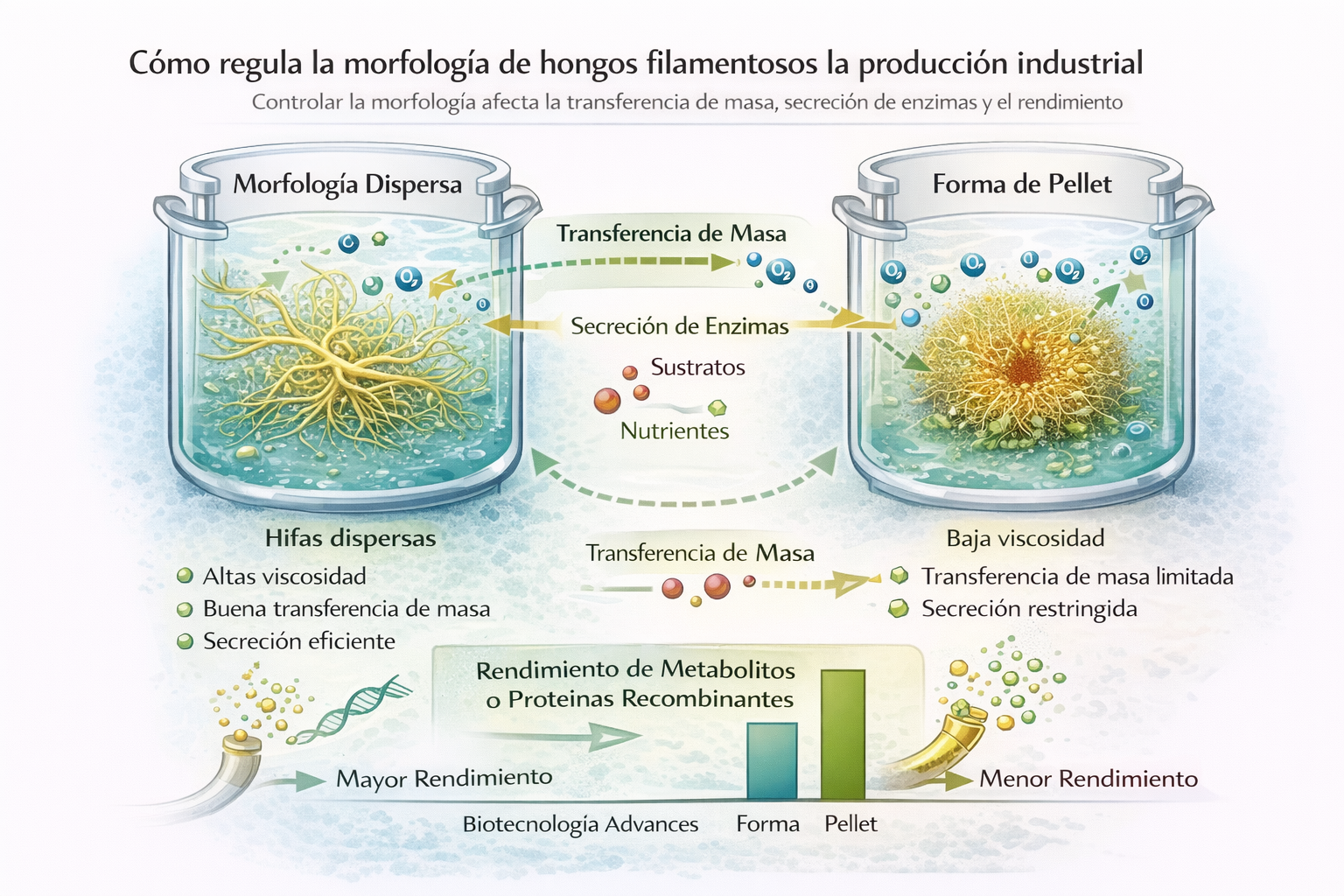 Se examina cómo la morfología de hongos filamentosos impacta directamente en la productividad y estabilidad de procesos industriales. Se describen estrategias genéticas y de bioproceso para controlar el crecimiento hifal y la formación de pellets, optimizando transferencia de masa y secreción de productos. El artículo presenta la regulación morfológica como una herramienta de diseño clave en biotecnología industrial.